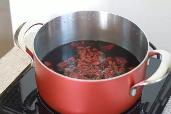 材料:红枣60g、枸杞20g、桂圆(干)30g、红糖 30g、水600g