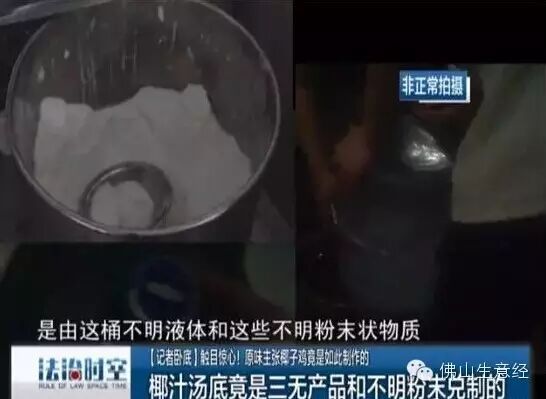 然而,深圳广电集团“法制频道”记者卧底深圳益田高发城池店“原味主张椰子鸡”,曝光原味主张销售的椰子鸡汤使用三无产品勾兑!!!!