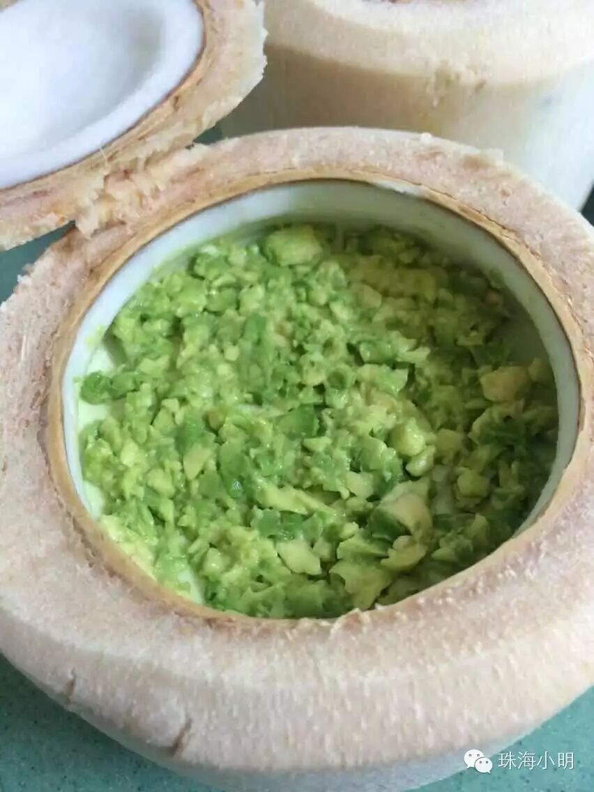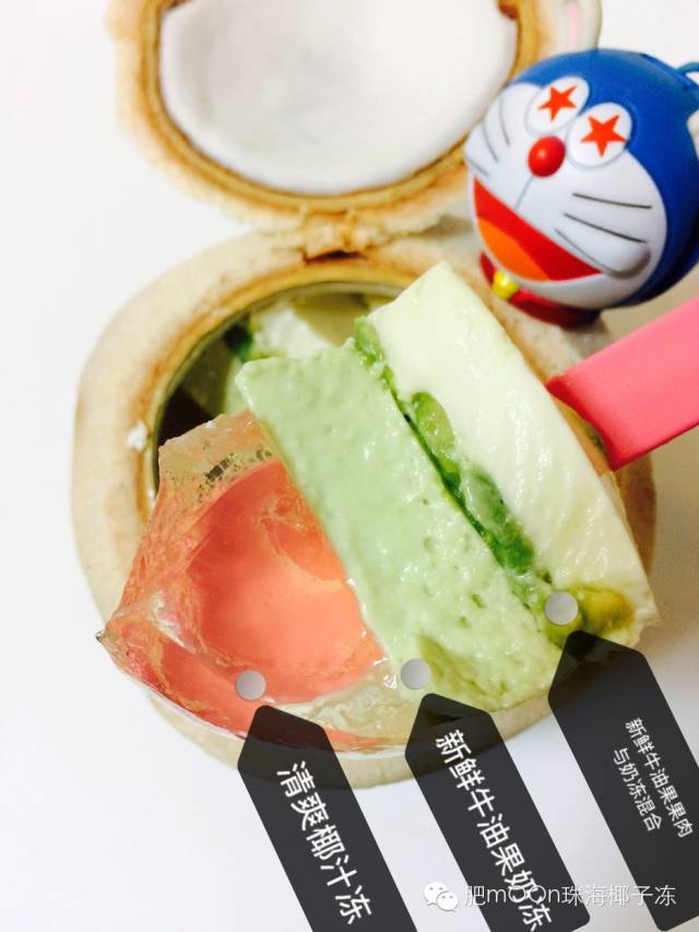 上层含牛油果果肉奶冻,中层新鲜牛油果奶冻,下层清爽椰汁冻