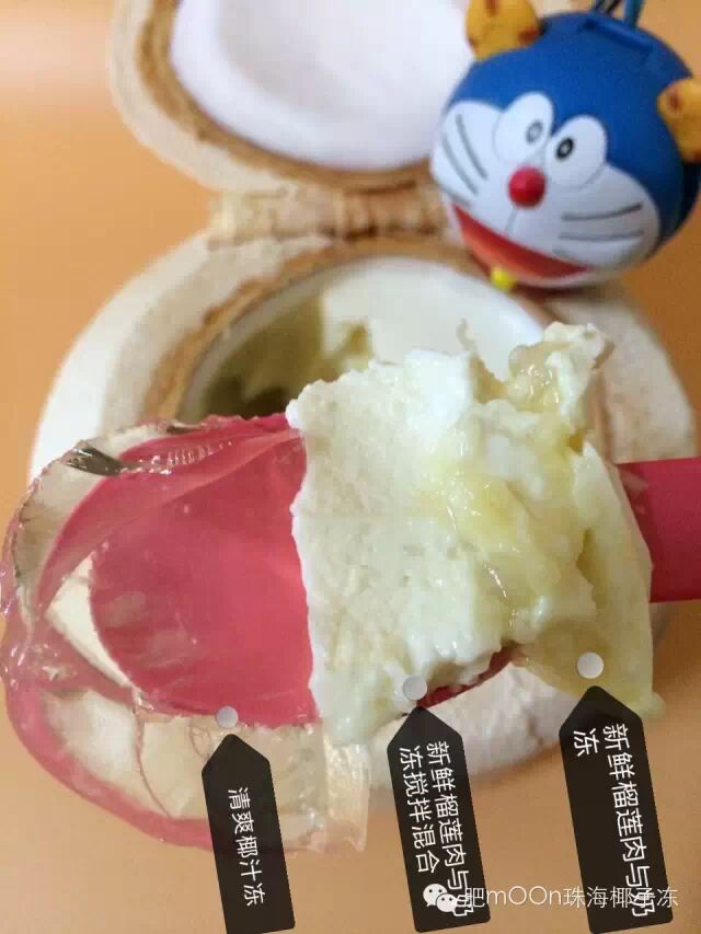 上层含榴莲肉奶冻,中层新鲜榴莲肉与奶冻搅拌混合,下层清爽椰汁冻