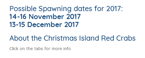 今年由于雨季来的晚一点,因此红蟹尚未开始迁移,根据当地生物学家的预测,可能的迁移时间是11月的14-16日和12月的13-15日。