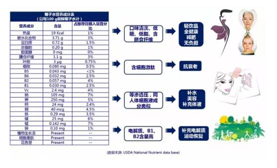 事实上,椰子水是完美的运动饮料 。有椰皮、椰壳、椰肉三层保护的椰子水是天然保健饮料,具有鲜为人知的神奇功效,享受“生命之水”的美誉。椰子水营养丰富,含有多种人体必需的氨基酸,其中所含的精氨酸、丙氨酸、胱氨酸和丝氨酸的含量比牛奶的还高。新鲜椰子水中含有丰富的电解质,钾、钠、钙、镁及糖类和蛋白质,是电解质丰富的天然来源之一。还可用来防治剧烈运动后呕吐、腹泻或脱水的症状。