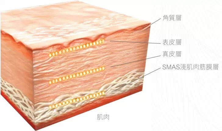 聚焦超声波能量绕过肌肤表层,精 确地将真皮层内的目标组织加热至 理想温度60°C至70°C,促使胶原 蛋白增生重组。 | 聚焦超声波能量精确地深入肌肤不 同深度,除可直达1.5及3.0mm的 真皮层,刺激胶原蛋白增生,使 底层肌肤逐渐收紧,更有效直达 4.5mm SMAS (浅肌肉筋膜层),热 能可令到SMAS层连同已松弛的浅 层肌肉、皮肤等一起收紧,以达到 拉提的效果。 |