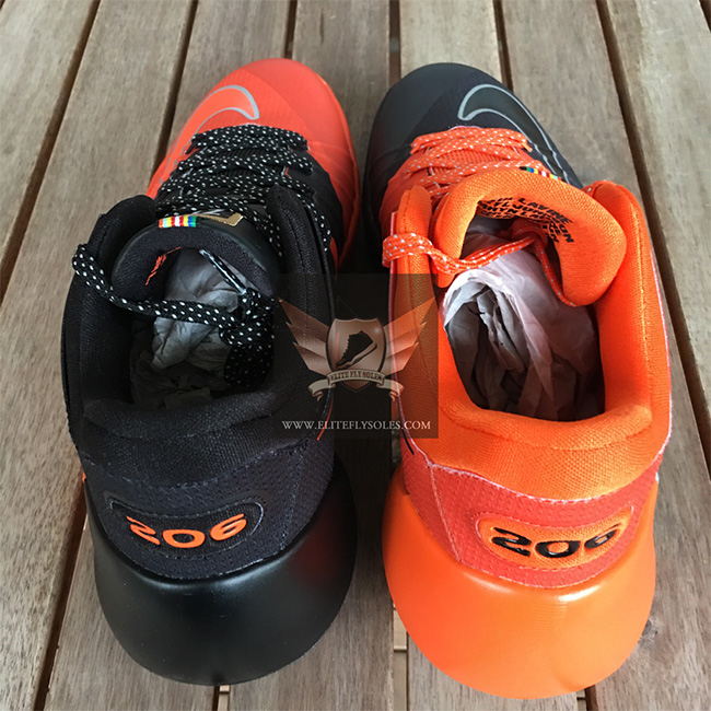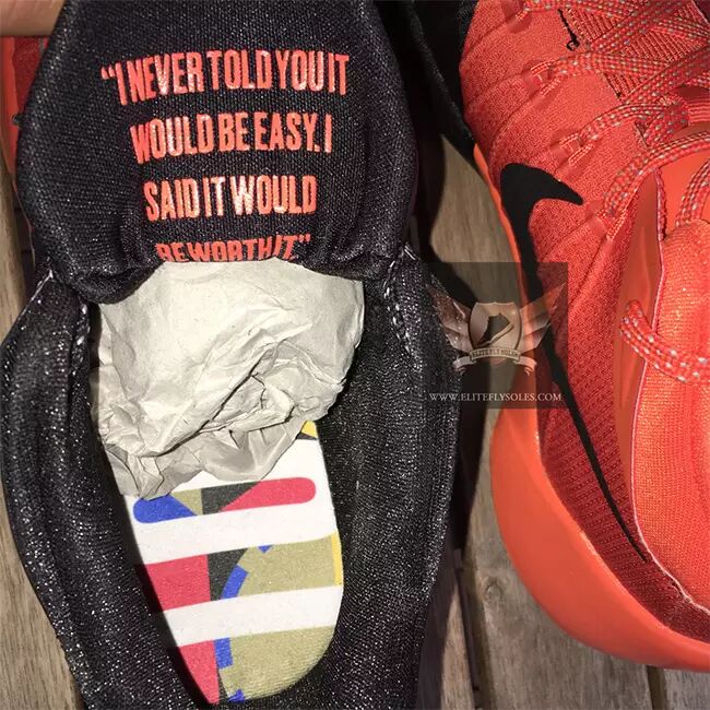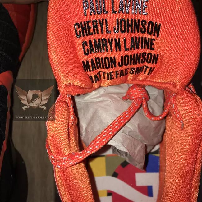 惊艳而独特的黑橙鸳鸯配色已经在整体视觉上得到了满分,透明的中底外侧呈现硕大的 Nike 字样,也颇具冲击力。而翻开鞋舌,左边是 “我从未告诉你会很简单,我是说那值得去付出”,右边则是多个人名,应该是拉文的家人名单。